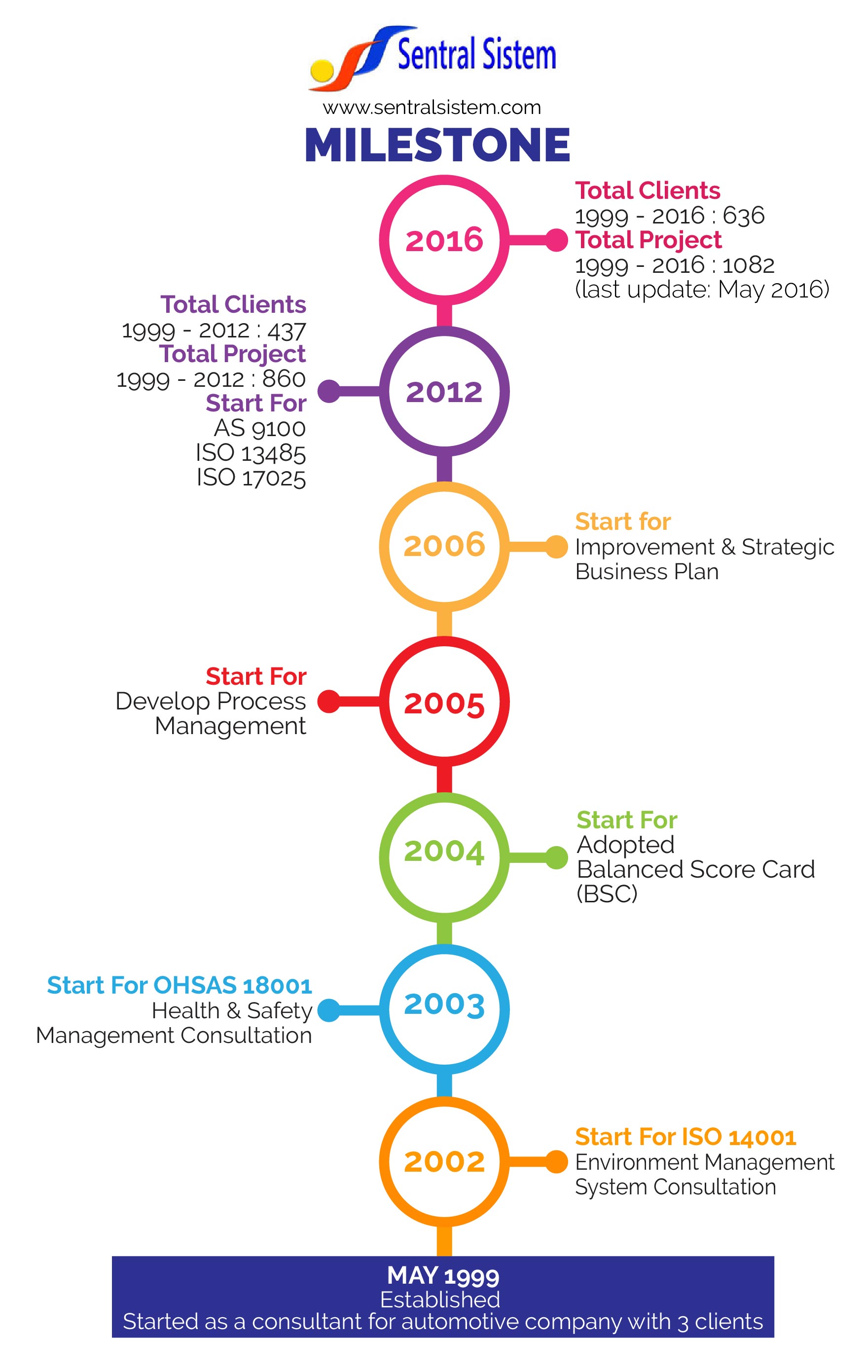 SENTRAL SISTEM CONSULTING didirikan pada tahun 1999. Hingga saat ini, Sentral Sistem terus berkembang menjadi konsultan yang berfokus pada improvement kinerja, baik kinerja Bisnis, Mutu, Lingkungan, Safety, Energi, hingga Peningkatan Kinerja Sumber Daya Manusia dan Budaya Perusahaan.