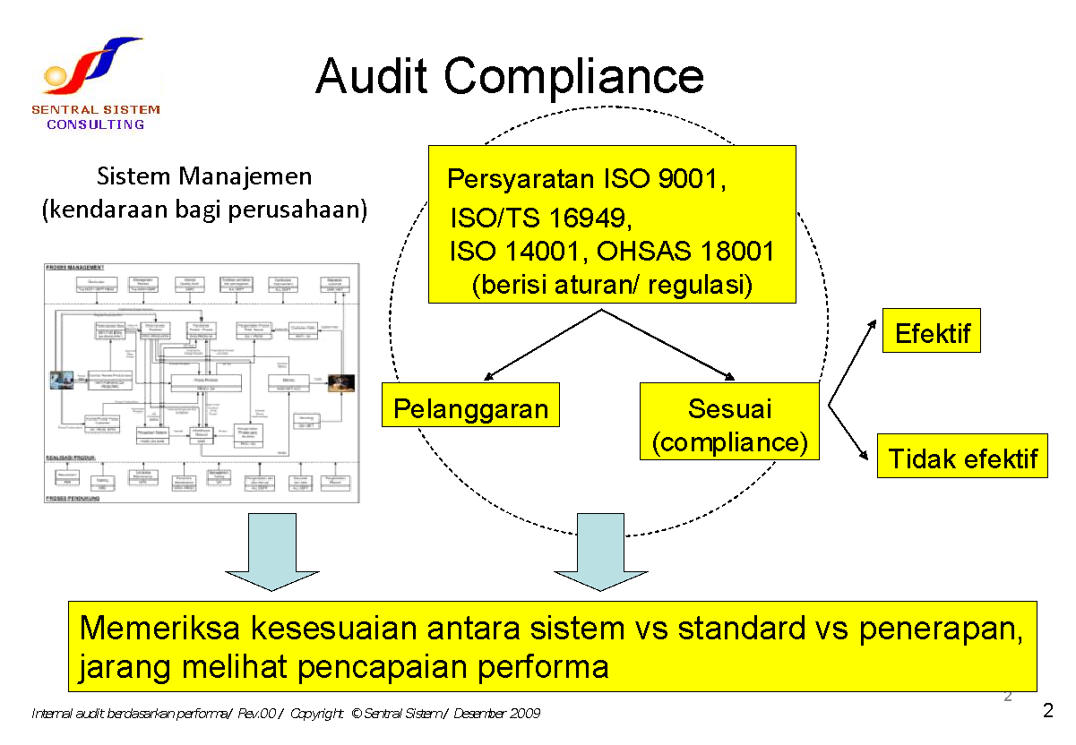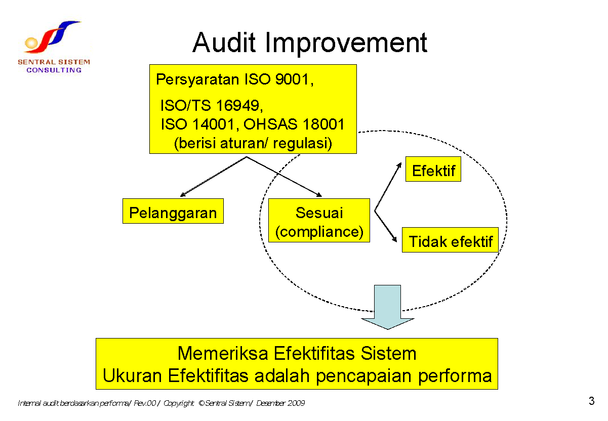 Oleh karena itu, Sentral Sistem mengembangkan Sistem Audit berbasis Peningkatan Kinerja (Improvement). Sebagai gambaran, berikut ini kami paparkan pebedaan Compliance Audit dengan Improvement Audit.